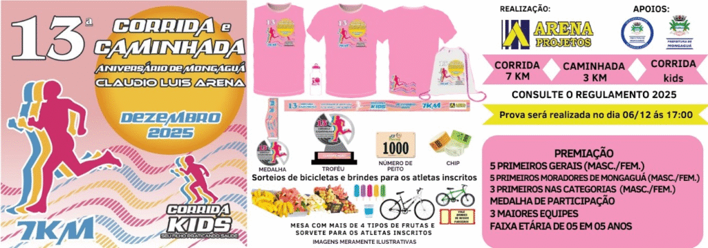 Participe da 13 Corrida e Caminhada Aniversario de Mongaguá em 06/12/2025. Evento com corrida kids e caminhada no centro de Mongaguá, SP. Inscreva-se já!