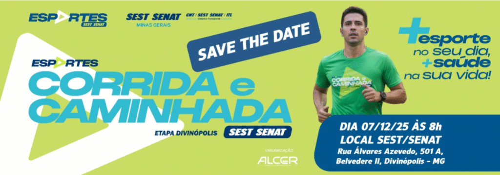 Participe da Corrida e Caminhada SestSenat em Divinópolis MG no dia 07/12/2025, com percursos de 5km e caminhada de 3km. Inscreva-se já!