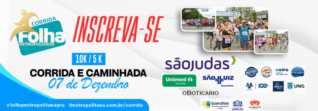 Participe da 4 Corrida Folha Metropolitana em Guarulhos SP, dia 07/12/2025. Modalidades: caminhada 3k, corrida 5k e 10k. Inscreva-se para corrida de rua 2025.