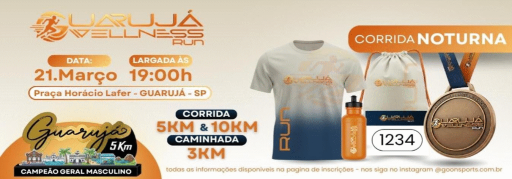 Participe da Guaruja Wellness Run 2025 em Guarujá SP. Corridas de 5k e 10k na melhor prova de rua de 2025. Inscreva-se já no site oficial!