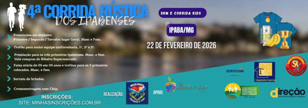 Participe da 4 Corrida Rustica Dos Ipabenses em Ipaba MG com distâncias de 5k e kids 800m. Inscreva-se para a prova de 2026 pelo Minhas Inscrições.